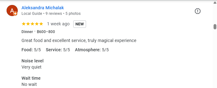 Verified Local Insight “Great food and excellent service, truly magical experience.”Aleksandra Michalak, Local Guide (5/5 Stars) Price per person: ฿600–800